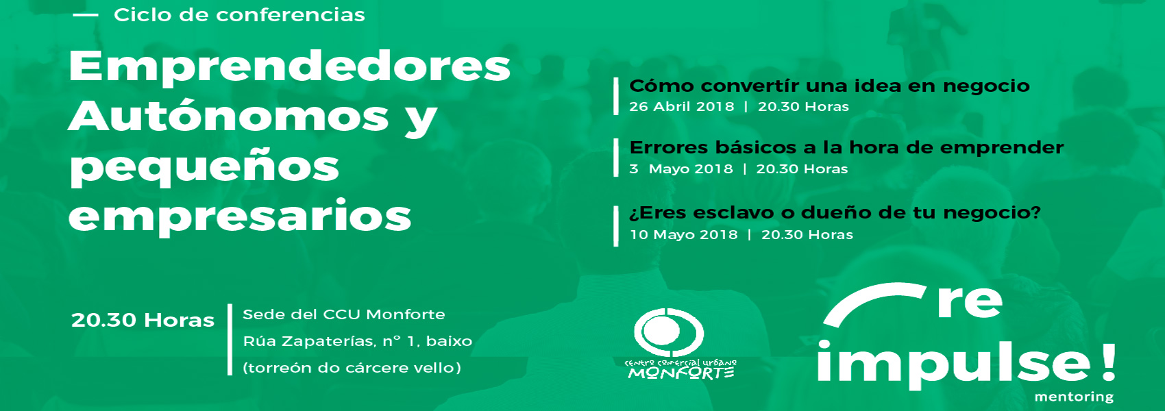 Teniendo presente estas premisas, el ciclo de conferencias del Programa REIMPULSE MENTORING - CCU MONFORTE 2018 fue creado para desarrollar diversas temáticas a partir de tres fases diferenciadas que aparecen en la mayoría de proyectos que alcanzan la madurez; se divide por tanto en tres conferencias cuyo título y enfoque son los siguientes:
