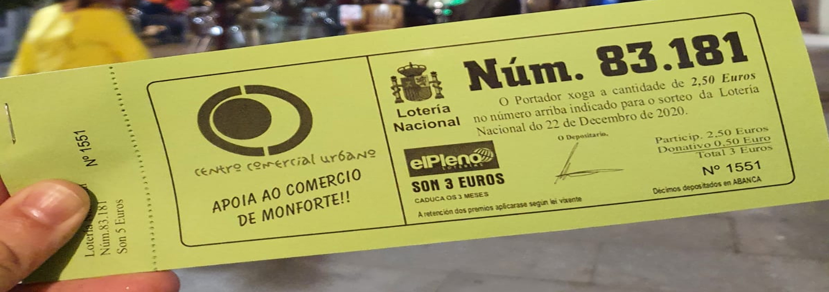 Como cada ano, desde o Centro Comercial Urbano de Monforte poñemos a disposición dos nosos clientes participacións de 3€ da Lotería de Nadal. Xa a podes comprar en máis de 60 establecementos asociados ao CCU.