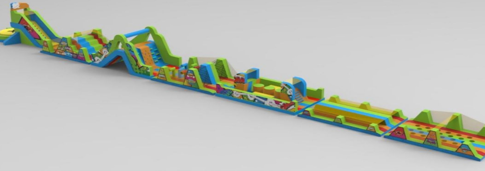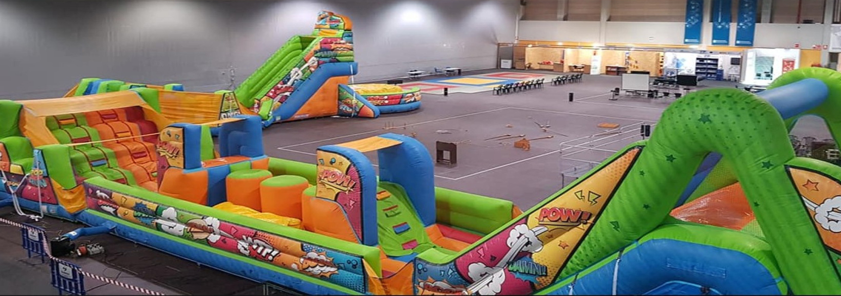 70 metros de inchables con 7 obstáculos diferentes: tobogán caída libre, habilidade, reptar, dificultade, escalada con tobogán, whipeout e mini rocódromo.