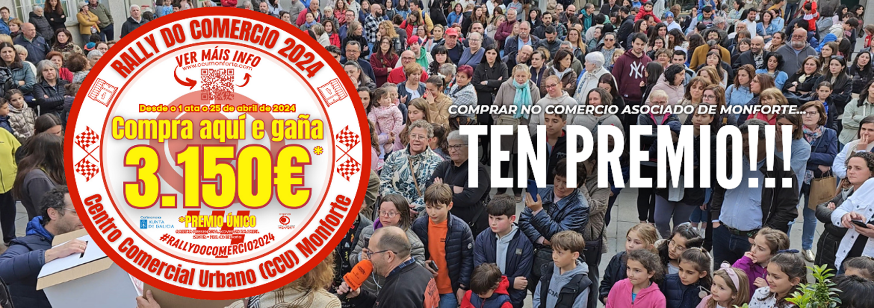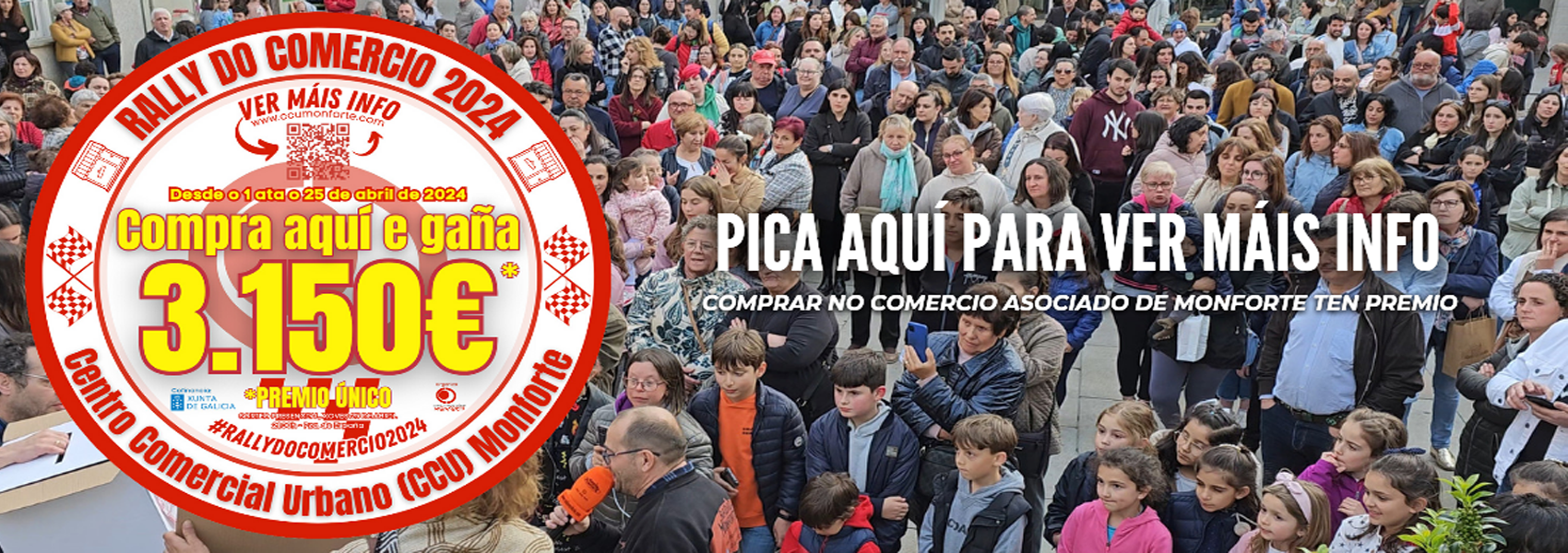 O "Rally do Comercio 2024" é unha campaña de dinamización comercial organizada polo Centro Comercial Urbano (CCU) de Monforte de Lemos en colaboración con 35 establecementos asociados (ver Bases do Sorteo). Trátase dunha iniciativa na que podes participar no sorteo dun premio único valorado en 3.150€. A través desta campaña, preténdese fomentar o comercio local e recompensar a fidelidade dos clientes que compren nos 35 establecementos participantes.