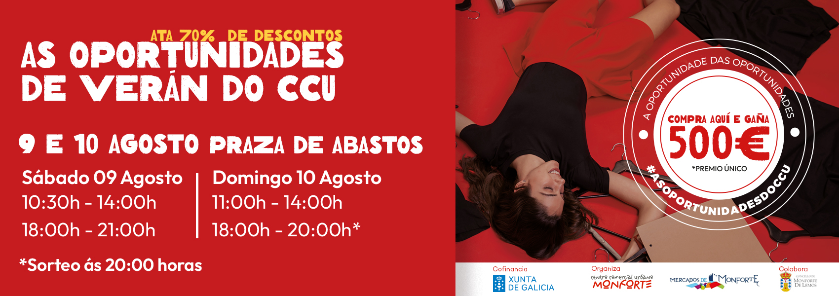 1. O sorteo de 500€ durante a Feira de Oportunidades de Verán do CCU é unha campaña de dinamización comercial organizada polo Centro Comercial Urbano (CCU) de Monforte coa colaboración de varios establecementos comerciais asociados.