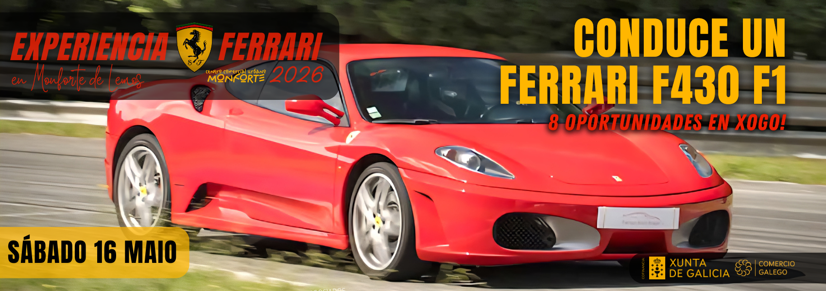 O Centro Comercial Urbano (CCU) de Monforte presenta unha das súas campañas máis espectaculares: a Experiencia Ferrari en Monforte 2026, unha oportunidade única para poñerse ao volante dun Ferrari F430 F1 e vivir unha auténtica experiencia de condución en estrada aberta.