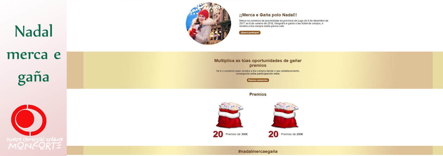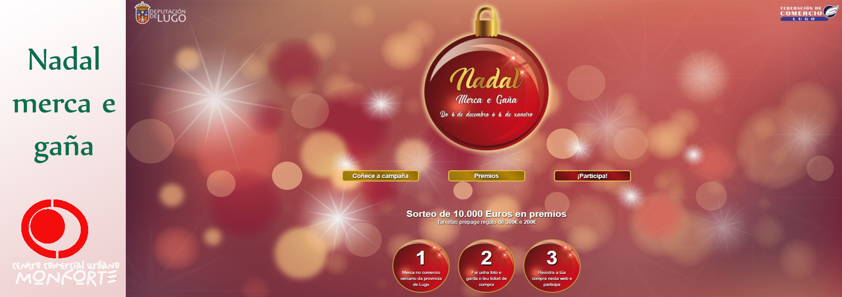 Esta campaña terá lugar entre o 6 de decembro de 2017 e o 6 de xaneiro de 2018 (ambos engadidos) e nela poderán participar todos os clientes do Centro Comercial Urbano de Monforte que merquen durante estes días nalgún dos establecementos asociados ao CCU (no apartado "Asociados" desta Web, podedes ver cales son).