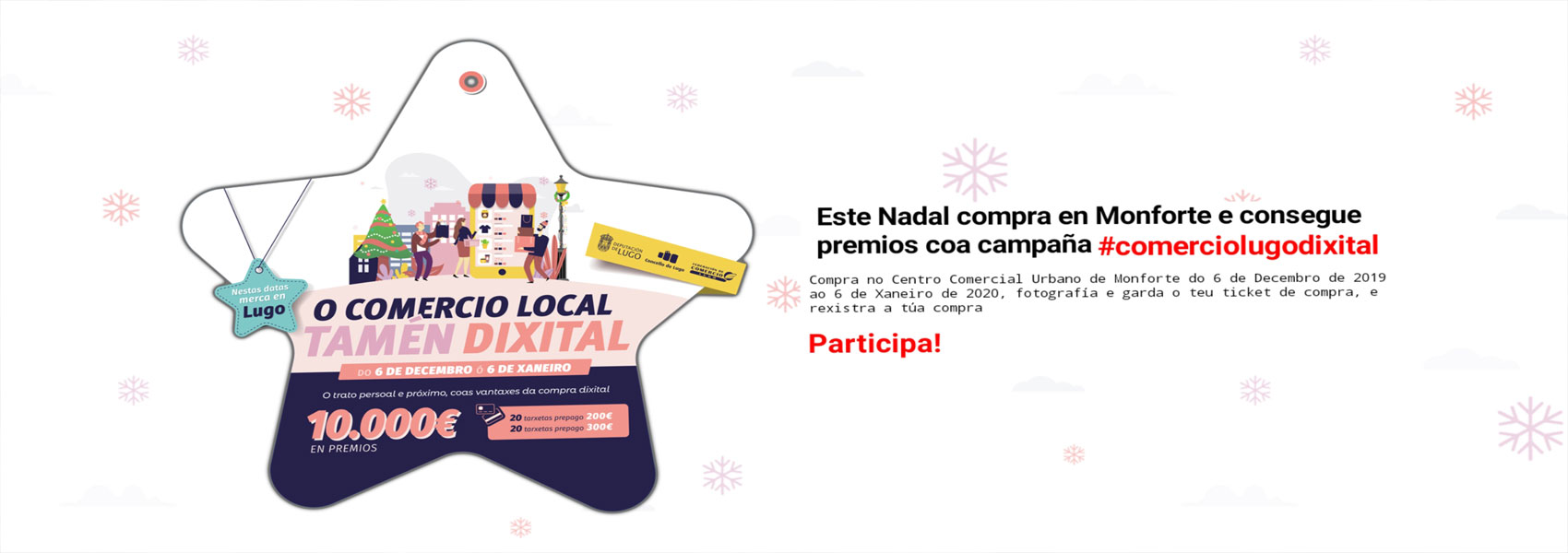 Merca no Centro Comercial Urbano de Monforte do 6 de Decembro de 2019 ao 6 de Xaneiro de 2020, fotografía (e garda) o teu ticket de compra e rexistra a túa compra en www.comerciolugodixital.com/participa Podes gañar ata 10.000 € en tarxetas agasallo de 200 e 300 euros!