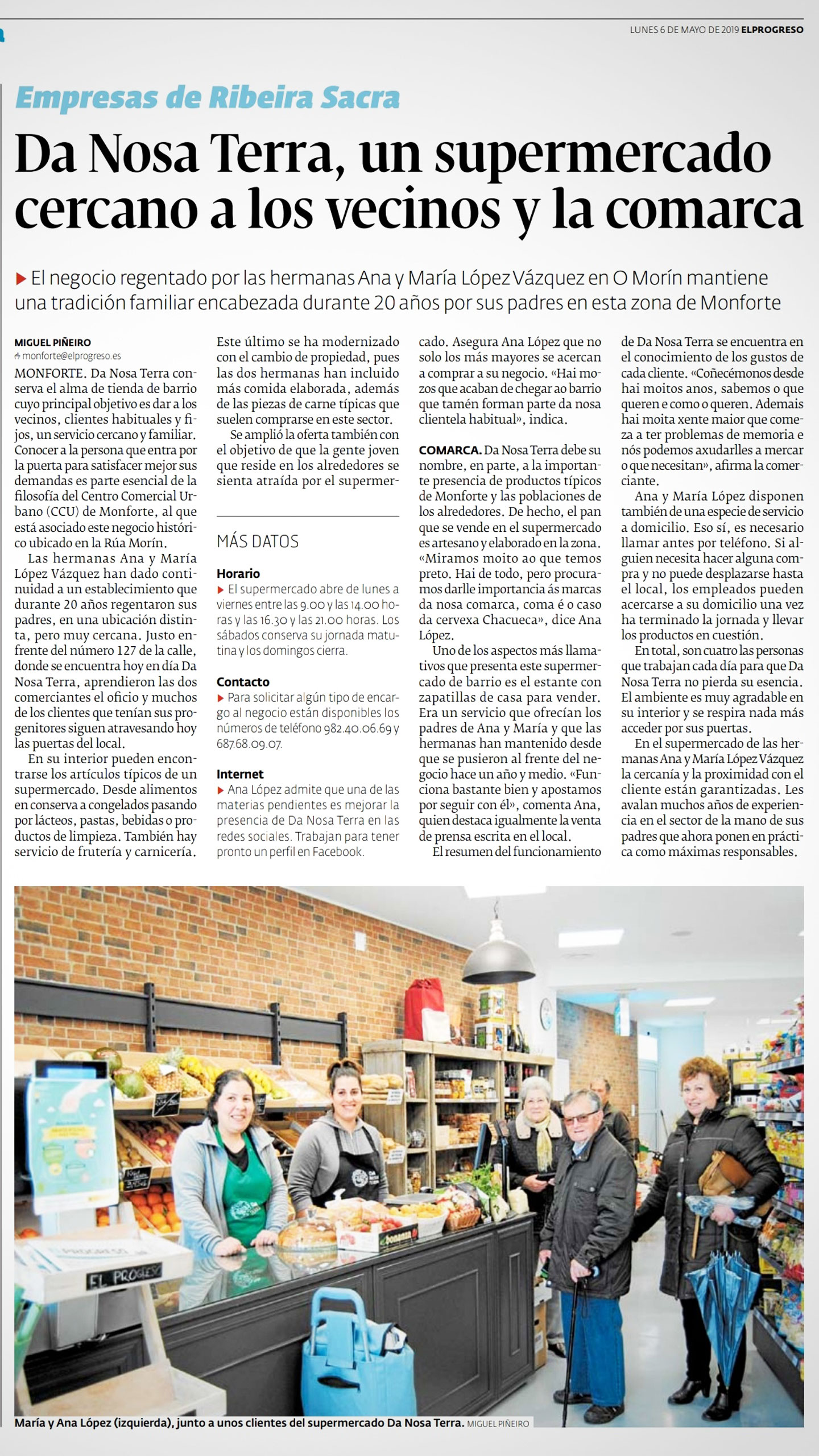 Como axuda para a promoción durante este ano 2020 dos establecementos asociados ao Centro Comercial Urbano de Monforte, e dado o interese que estamos seguro despertará nos seus lectores, o CCU chegou a un acordo de colaboración con El Progreso de Lugo para publicar na edición impresa, cada luns durante o próximo ano, unha publireportaxe a páxina completa dun establecemento asociado máis o agasallo de 100 xornais para que o negocio distribúa entre os seus clientes. COMO NOVIDADE ESTE ANO, A REPORTAXE TAMÉN SE PUBLICARÁ NA VERSIÓN DIXITAL DO XORNAL. Cun custo de 65€, o CCU subvencionará 15€ para que os nosos asociados só teñan que pagar 50€ (ive incluído) por este servizo.