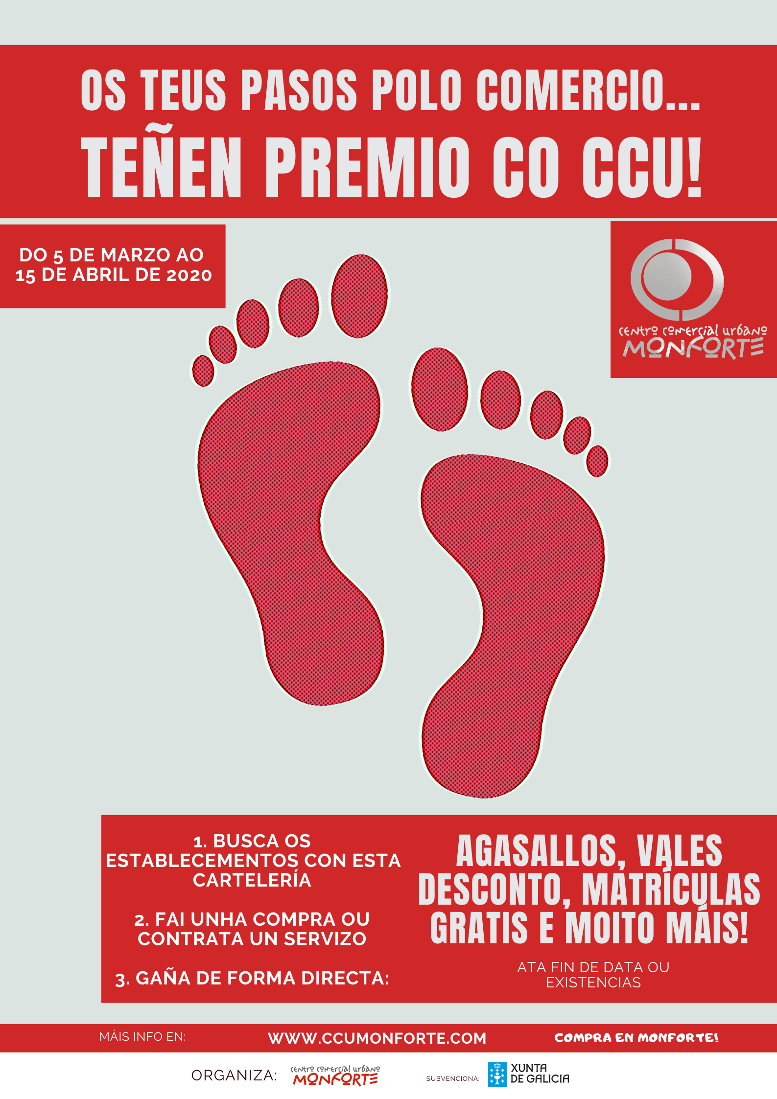 Desde o 5 de marzo, e ata o próximo 15 de abril, os teus pasos polo comercio local terán premio grazas ao Centro Comercial Urbano (CCU) de Monforte. 39 negocios asociados ao CCU poñerán en circulación máis de 4.500 vales agasallo para premiar de forma directa a fidelidade dos seus clientes.