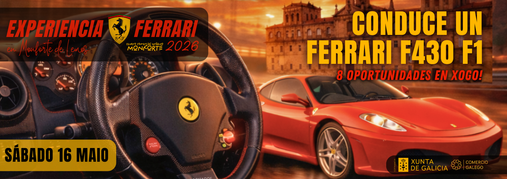 O Centro Comercial Urbano (CCU) de Monforte presenta unha das súas campañas máis espectaculares: a Experiencia Ferrari en Monforte 2026, unha oportunidade única para poñerse ao volante dun Ferrari F430 F1 e vivir unha auténtica experiencia de condución en estrada aberta.